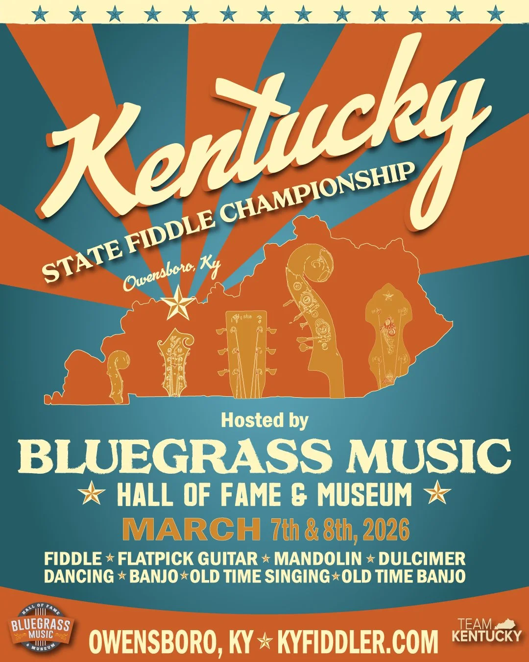 Join us for the Kentucky State Fiddle Championship on March 7th & 8th, 2026! With multiple categories and cash prizes, the Kentucky State Fiddle Championship will take place at the Bluegrass Music Hall of Fame & Museum in Owensboro, Kentucky. There is no fee to enter the contest. Doors will open at 8 am, and the contest will begin at 10 am. Online pre-registration is now open, and you can still sign up for free on the day of the contest.